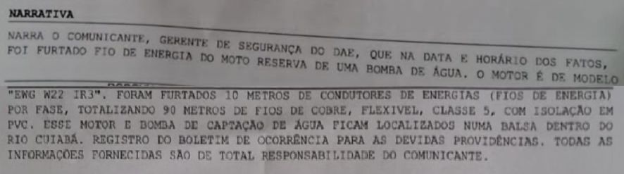 "Foram furtados 10 metros de condutores de energia (fios de energia) por fase, totalizando 90 metros de fios de cobre, flexível, classe 5, com isolação em PVC. Esse motor e bomba de captação de água ficam localizados numa balsa dentro do Rio Cuiabá", consta em trecho do BO.