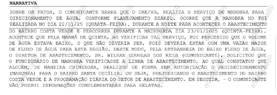 "Ao verificar tal serviço, foi percebido que o volume de água estava baixo, o que não deveria ser [...]. Deste modo, pela estranheza do baixo fluxo de água, o diretor de abastecimento, Sr. Wilhan Douglas, solicitou que o funcionário de manobra verificasse a linha de abastecimento, ao qual constatou que alguém, de maneira criminosa, realizou de forma sem autorização o redirecionamento (manobra) para o bairro Santa Cecília. Ou seja, prejudicando o abastecimento do Bairro Costa Verde e a programação diária do setor de abastecimento", consta em trecho.
