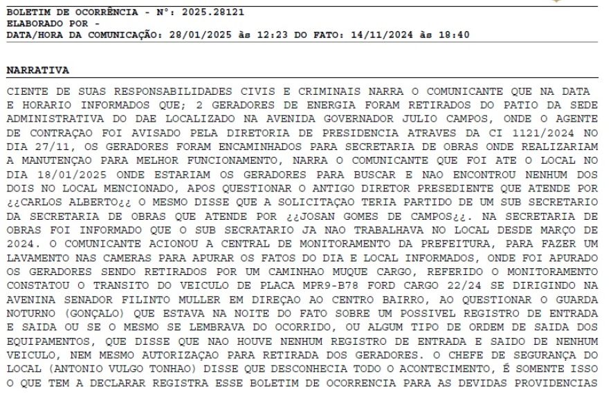 O sexto boletim acessado pela reportagem, registrado no dia 28 de janeiro, denunciou o desaparecimento de dois geradores de energia que estavam na sede administrativa do departamento.