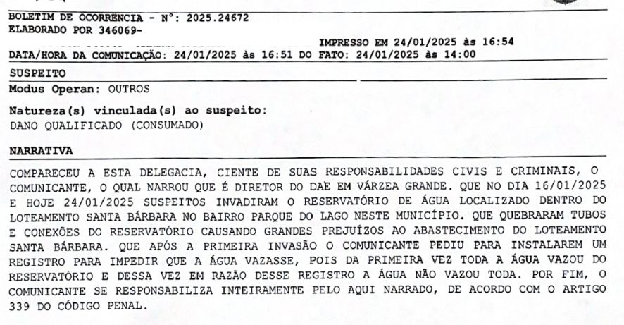 Dos 10 boletins confeccionados, o MidiaNews teve acesso a sete, que relatam invasões, furtos e danos a equipamentos essenciais para a distribuição de água. Quatro deles foram elaborados no dia 25 de janeiro.