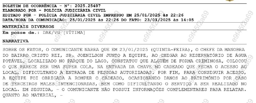 Outro boletim diz que, no mesmo dia, uma equipe do DAE constatou que criminosos usaram supercola para bloquear o cadeado de acesso ao reservatório do Parque do Lago, dificultando a realização dos serviços.