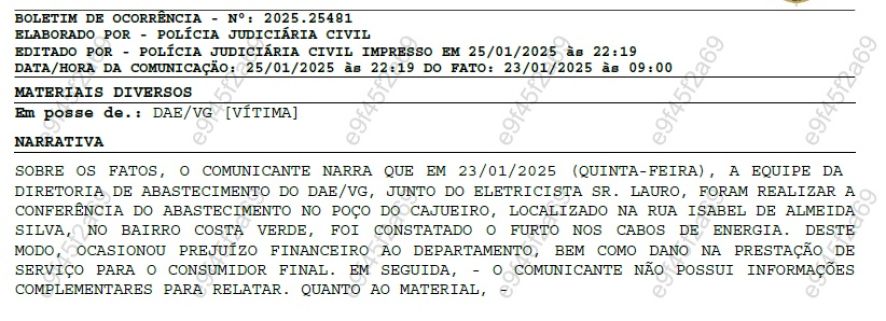 O sétimo BO foi registrado no último dia 7 de fevereiro pelo gerente de segurança do DAE, Gilmar França Santos, que disse terem sido furtados fios de energia de um motor reserva de uma bomba d'água.
