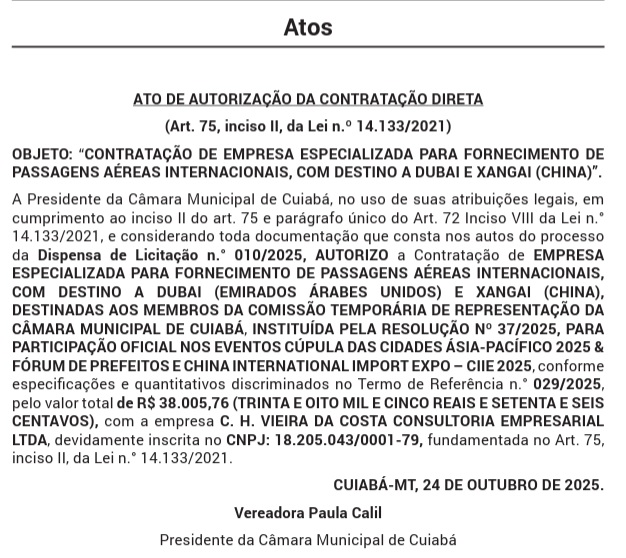 A presidente da Câmara Municipal de Cuiabá, vereadora Paula Calil (PL), assinou a autorização de contratação direta para o pagamento por R$ 38 mil para financiar passagens aéreas para os vereadores Eduardo Magalhães (Republicanos) e Demilson Nogueira (PP) à Ásia.