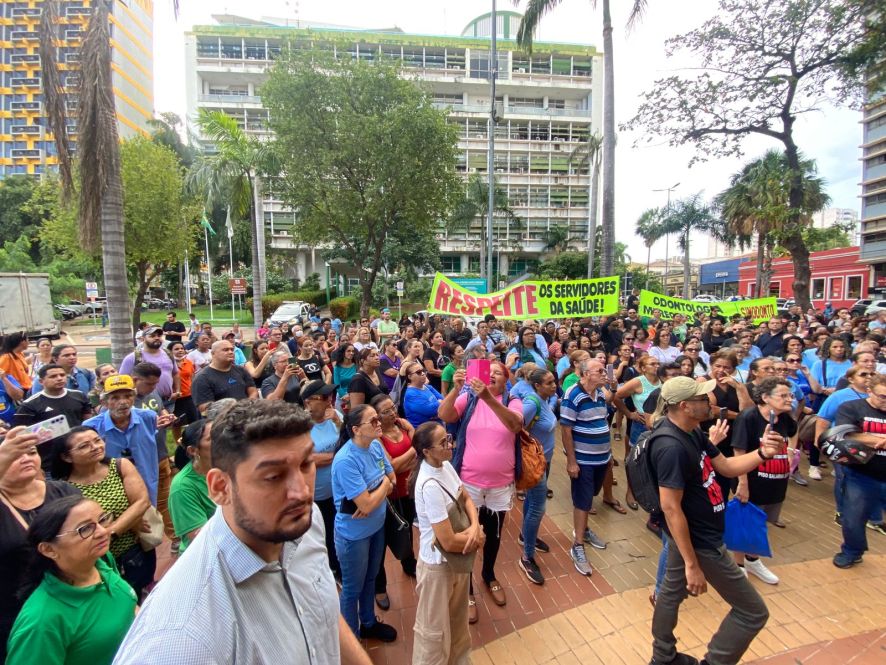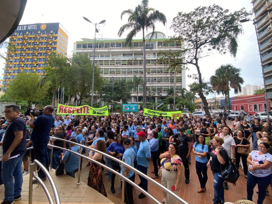 Servidores públicos municipais realizaram um protesto na tarde desta quarta-feira (3) em frente à Prefeitura de Cuiabá contra o corte do adicional de insalubridade, que é pago mensalmente junto com os salários.