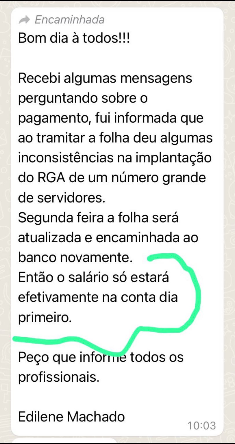Em nota atribuída à secretária de Educação do Município, Edilene de Souza Machado, há a informação de que ao tramitar a folha no sistema de pagamento, houve inconsistências na implantação da RGA (Revisão Geral Anual). O pagamento de 3% da RGA foi prometida para esse mês.