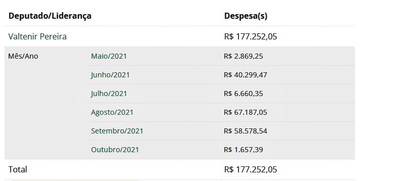 Em seis meses de mandato no Congresso, Valtenir gastou um total de R$ 177.252,05.