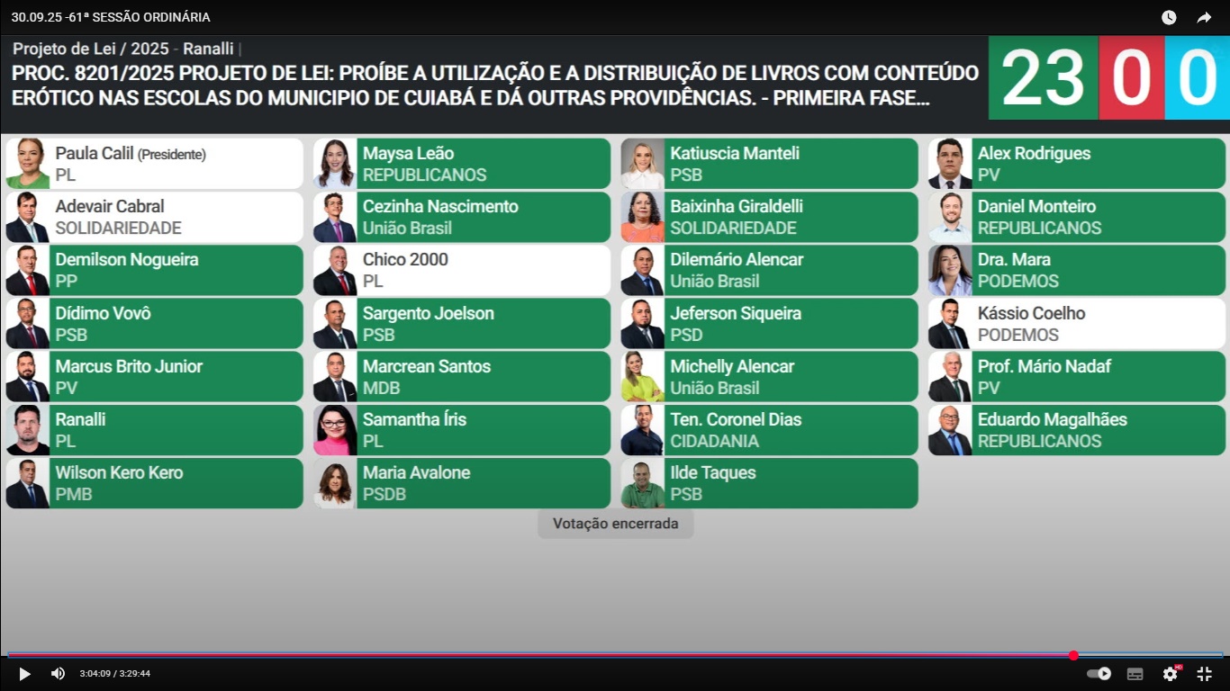O projeto do vereador Rafael Ranalli (PL) que proíbe a utilização e distribuição de livros com conteúdo erótico nas escolas municipais de Cuiabá foi aprovado em primeira votação com o voto de 24 vereadores. A segunda votação do projeto deve acontecer na próxima quinta-feira (2).
