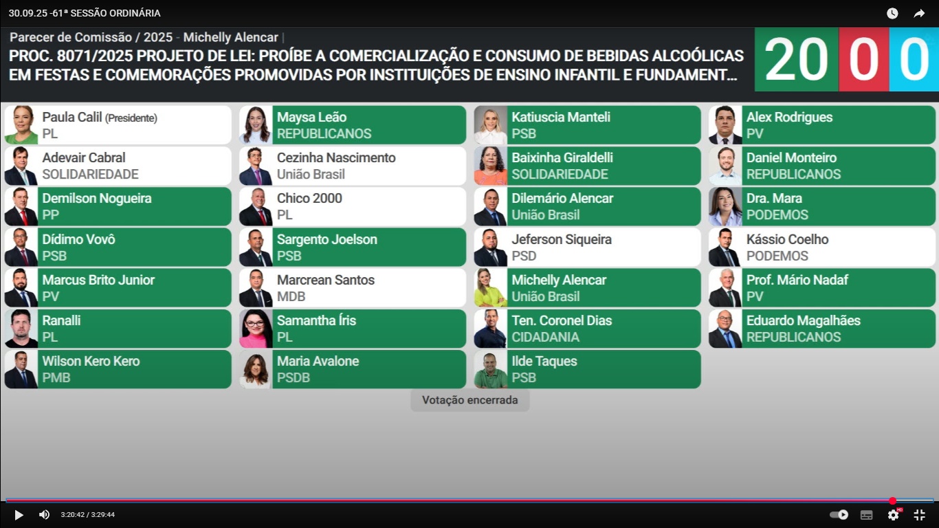 O texto que proíbe a comercialização e o consumo de bebida alcoólica, por qualquer pessoa, em festas e comemorações promovidas por instituições de ensino infantil e fundamental na Capital também foi aprovado pelo placar de 20 votos. O texto tinha recomendação da CCJR (Comissão de Constituição e Justiça e Redação) e da Comissão da Criança e do Adolescente para aprovação, mas com emendas.