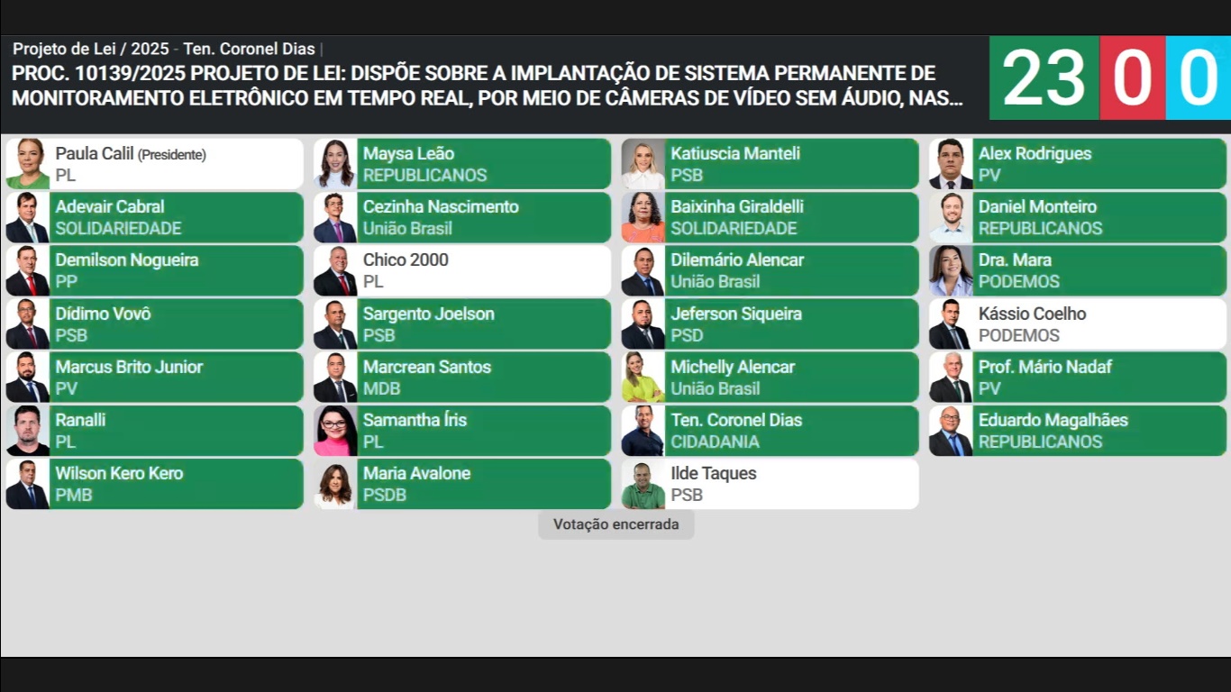Já o projeto do vereador Tenente Dias (Cidadania), que prevê a implantação de um sistema de monitoramento eletrônico em tempo real, por meio de câmeras de vídeo sem áudio, nas escolas e instituições que integram o sistema municipal de educação, também foi aprovado em primeira votação por 24 votos.