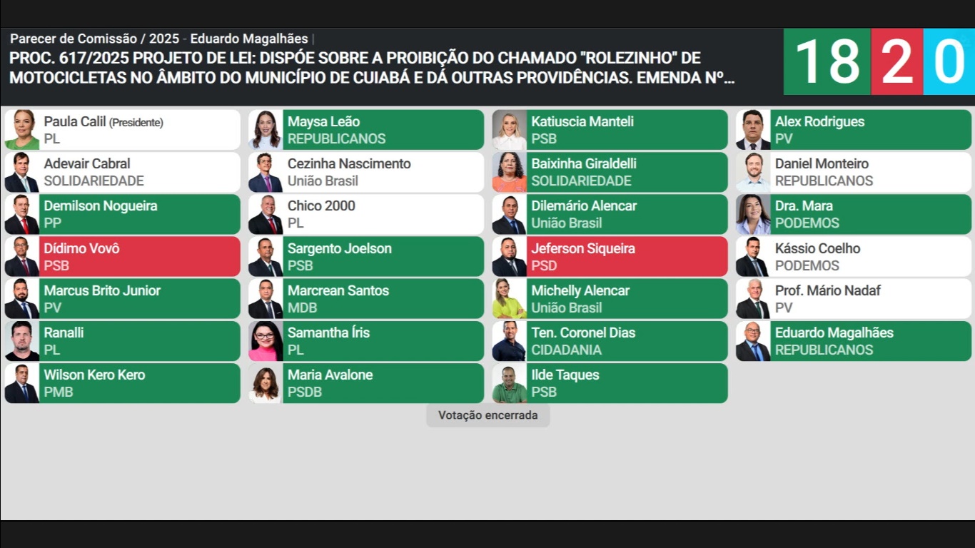 Os dois primeiros citados passaram em primeira votação e ainda passarão por uma segunda, caso também sejam aprovados, seguirão para sanção do prefeito Abilio Brunini (PL). Já os dois últimos (proibição de bebidas alcoólicas e 'rolezinhos') tiveram somente o parecer aprovado em comissões e agora ainda passarão pelas duas votações no plenário.
