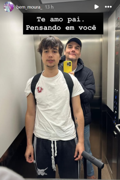 Em seu perfil oficial, o primogênito abriu o coração ao compartilhar uma foto rara da dupla, em um momento rotineiro no elevador e escreveu na legenda: “Te amo, pai. Pensando em você”.