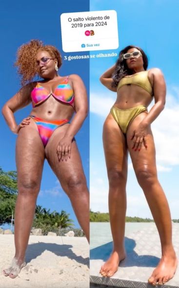 De um lado, uma foto em que posa de biquíni em 2019, e outra mais atual.