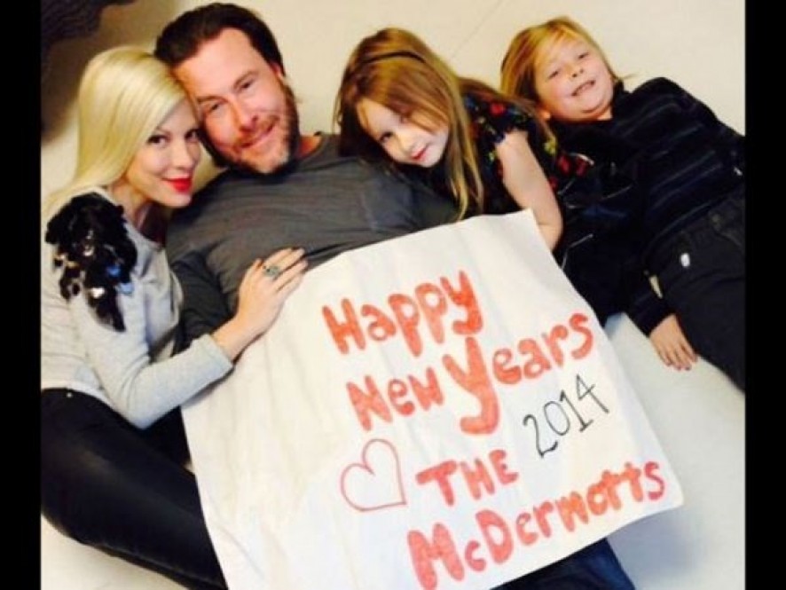 A atriz Tori Spelling ignorou os boatos de que teria traído o marido, Dean McDermott, e publicou uma foto ao lado do amado e de dois de seus filhos, desejando um Feliz 2014 aos fãs.