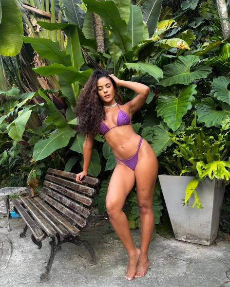 Nas fotos, ela aparece vestindo um conjunto roxo e posando em meio à natureza.