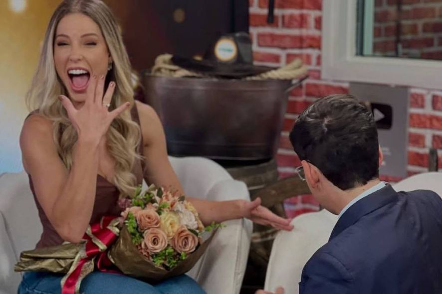 O momento aconteceu na segunda-feira (22), durante a gravação do c No estúdio, o jornalista se ajoelhou diante da dentista —conhecida também por ter sido namorada do ator Marcello Novaes— e entregou um buquê acompanhado dos anéis.
