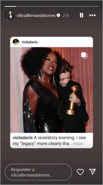 A americana publicou cliques ao lado da brasileira, entre outros registros de sua participação no Globo de Ouro, premiação que deu a Fernanda o troféu de Melhor Atriz de Drama pelo filme “Ainda Estou Aqui”.