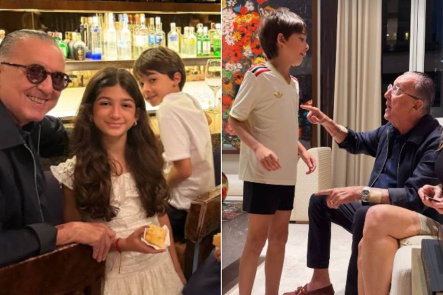 Nas imagens, o apresentador aparece sorridente, brincando com Tatá (Octávio) e Milla, filhos de Andrea com Popó Bueno —piloto e empresário, além de um dos herdeiros do narrador.