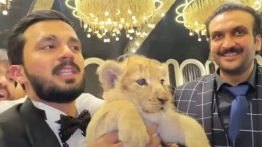 Rajab Butt, influenciador do Paquistão, recebeu uma pena inusitada após ganhar um filhote de leão em seu casamento.