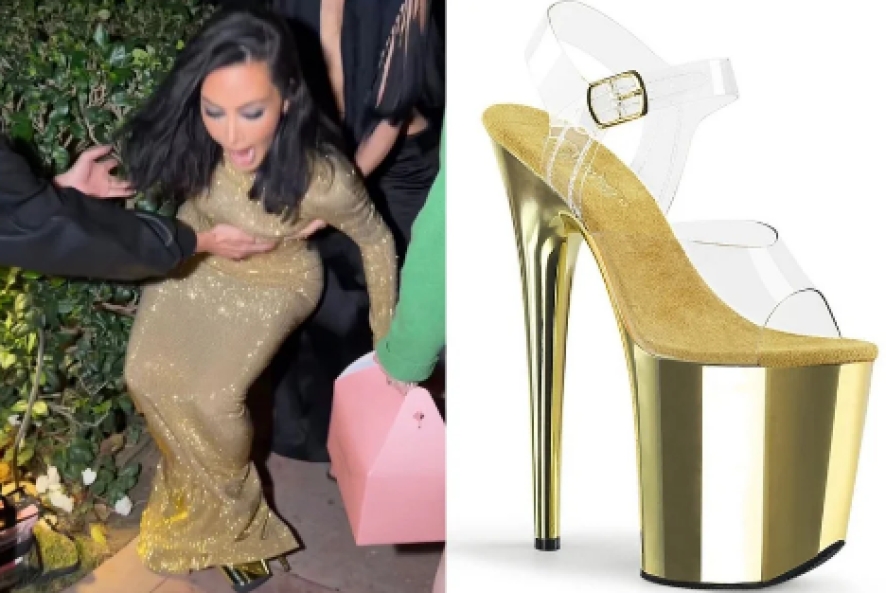 Apesar do luxo no vestido, o que Kim usou nos pés também gerou uma série de comentários: saltos de US$ 80 da marca Pleaser Shoes, especializada em calçados para dançarinas e performers. Neles, a Kardashian tropeçou e quase caiu nos arredores do evento.
