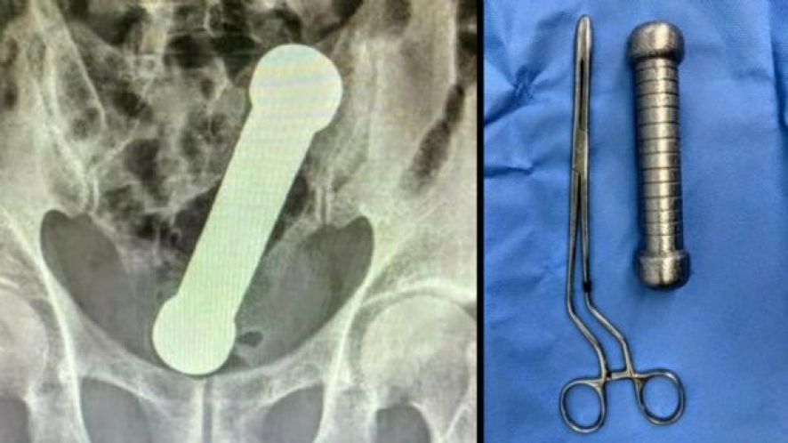 Segundo as imagens, o haltere estava entre o reto e o intestino grosso do paciente, que, depois do exame, admitiu ter introduzido o peso de academia no corpo para obter satisfação sexual.Para retirar o objeto, a equipe médica sedou o homem.