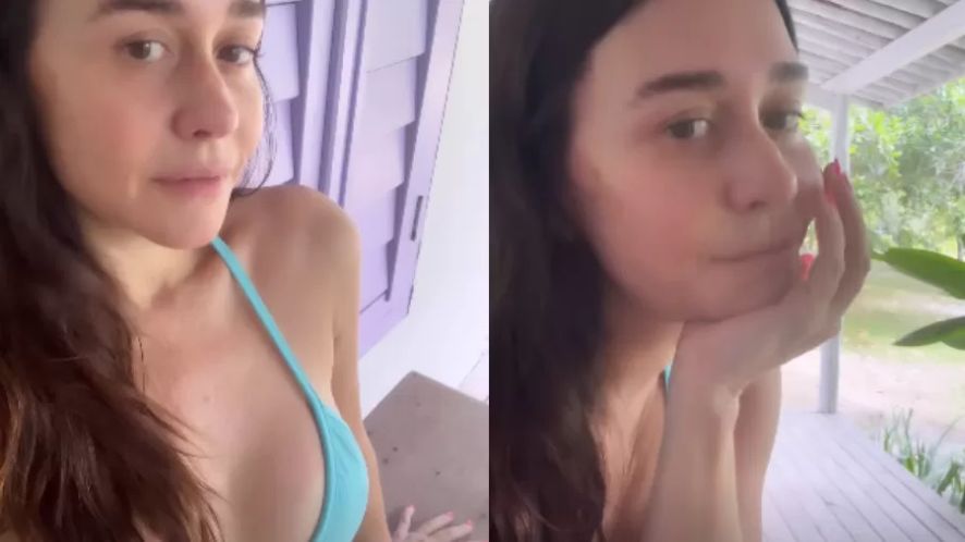 Ela gravou um vídeo tomando sol, postado na tarde de ontem, filmando um pouco do cenário em volta da casa em que ela está hospedada, cercada de árvores e com o barulho dos passarinhos ao fundo.