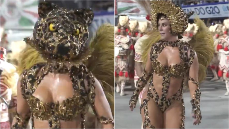 Enquanto sambava na avenida, ela ‘virava onça’, símbolo da agremiação, com uma máscara de onça que tinha os olhos iluminados.