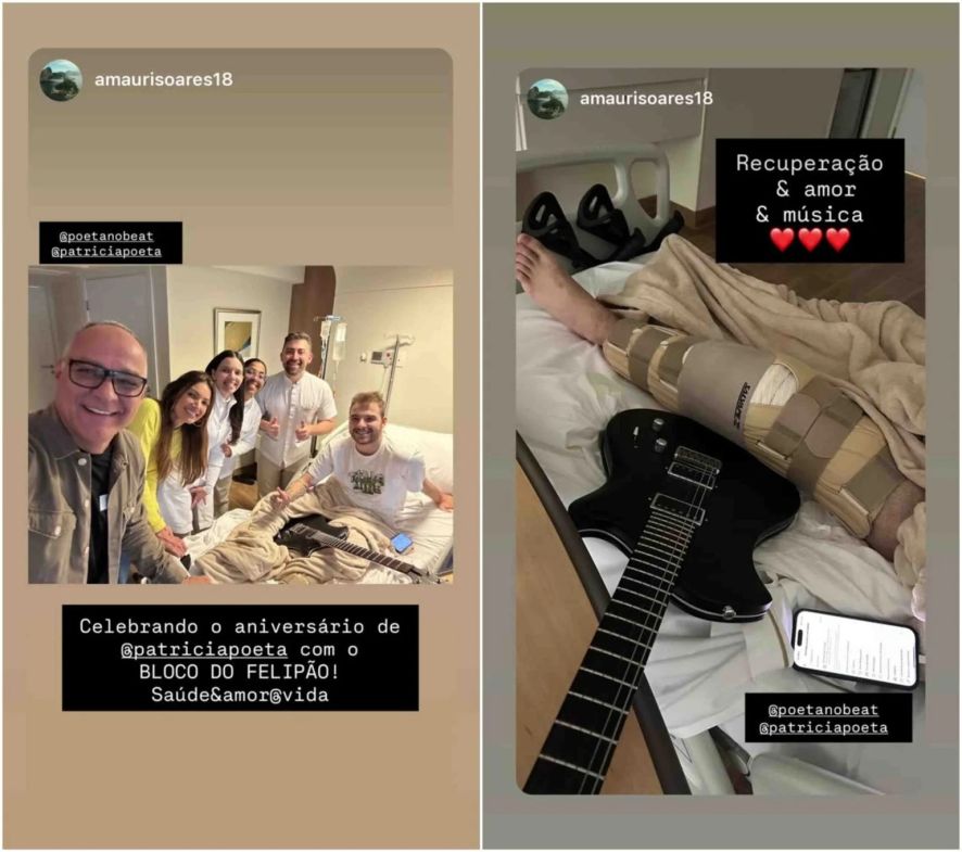 “Celebrando o aniversário de Patrícia Poeta com o bloco do Felipão! Saúde e amor e vida”, ele escreveu em uma das publicações nos Stories do Instagram. “Recuperação e amor e música”, disse ele na publicação seguinte, se referindo ao filho.