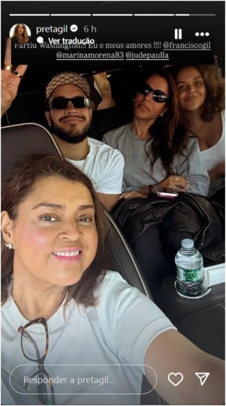 Em clique publicado nos Stories, Preta aparece acompanhada do filho, Francisco Gil, e das amigas Ju de Paulla e Marina Morena, registrado antes do voo.
