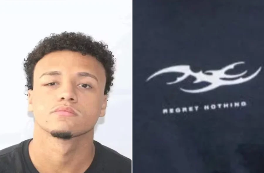 A peça, usada pelo jovem ao se entregar às autoridades, contém a frase “Regret nothing”, interpretada como uma provocação ao processo pelo qual é acusado.