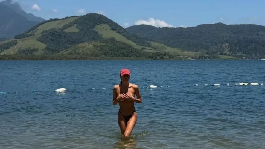 Em uma das fotos, ela aparece fazendo topless. A designer de moda está no mar vestindo apenas a parte de baixo do biquíni e um boné.