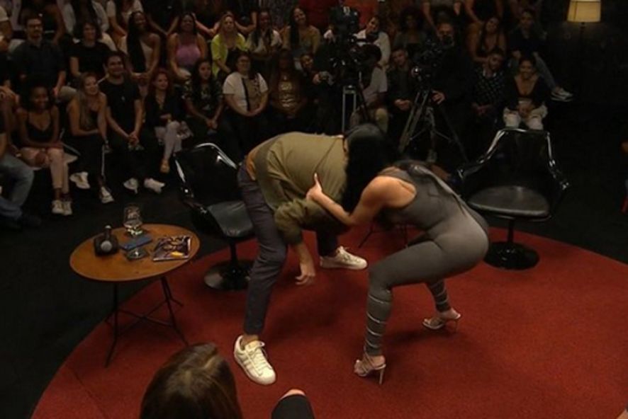 Depois, Simaria acabou dando um soco no apresentador, para espanto da jornalista Andréia Sadi e da atriz Fernanda Paes Leme, também convidadas da atração.