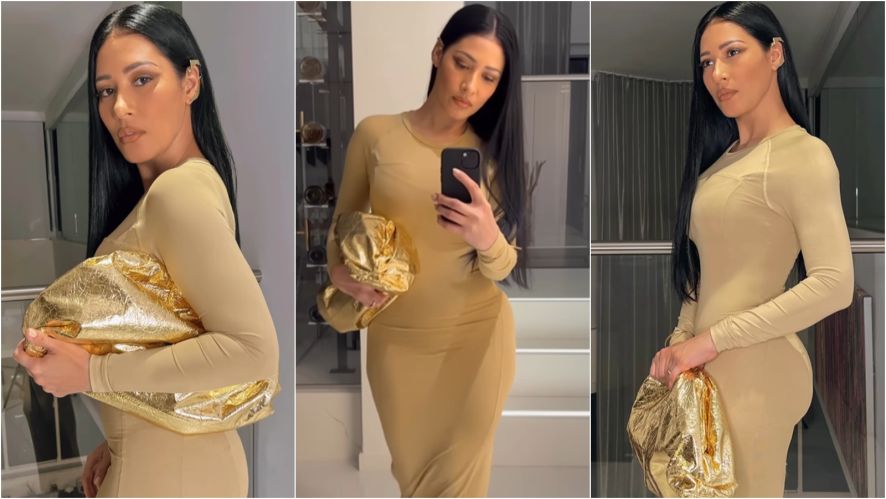 Linda como sempre, a sertaneja surge usando um vestido longo e coladíssimo em tom nude. Porém o que chamou a atenção foi a bolsa dourada que ela elegeu para completar a produção.