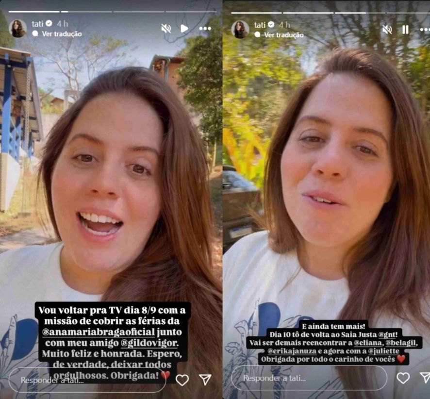 “Vou voltar pra TV dia 8/9 com a missão de cobrir as férias da Ana Maria Braga. Muito feliz e honrada. Espero, de verdade, deixar todos orgulhosos. Obrigada”, escreveu Tati na legenda ao postar o vídeo.
